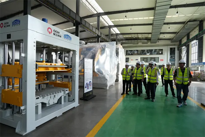 Em seguida, os convidados foram até a área de exposição de amostras de tijolos e observaram vários tijolos permeáveis, tijolos de pavimentação, blocos e outros produtos de alta qualidade produzidos pelos equipamentos QGM, e expressaram grande interesse nas conquistas tecnológicas de "reciclagem de resíduos sólidos" da empresa. Na área de exibição de equipamentos para fabricação de tijolos, o presidente Lin Boqian e seu grupo inspecionaram de perto os equipamentos principais, como a máquina formadora de blocos totalmente automática e a linha de produção inteligente desenvolvida independentemente pela QGM, e trocaram vantagens técnicas e perspectivas de aplicação no mercado no local. O presidente Lin Bo afirmou plenamente as contribuições notáveis da QGM nas áreas de fabricação de equipamentos de alta qualidade e materiais de construção ecológicos, e enfatizou: "A QGM é um modelo inovador de empresas privadas em Quanzhou. Esperamos desempenhar ainda mais o papel da federação como uma ponte no futuro, promover o desenvolvimento coordenado da cadeia industrial e ajudar a "Manufatura Inteligente de Quanzhou" a se tornar global". O vice-gerente geral Fu Huabin respondeu que a empresa continuará a aumentar o investimento em pesquisa e desenvolvimento e a trabalhar com parceiros de todas as esferas da vida para explorar novas oportunidades para o desenvolvimento integrado de equipamentos inteligentes e fabricação verde.