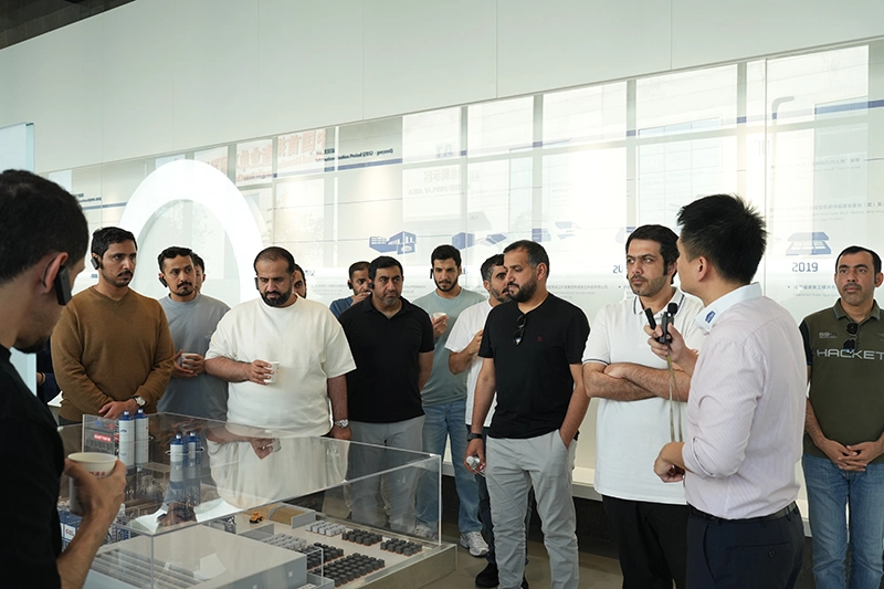 No centro de controle da Plataforma de Serviços em Nuvem de Equipamentos Inteligentes, a delegação observou um cenário inteligente de operação e manutenção demonstrando como os equipamentos podem ser monitorados remotamente. Como uma inovação central da Quanzhou Machinery, esta plataforma integra tecnologias de ponta, como computação em nuvem, big data e inteligência artificial. Ele pode coletar dados operacionais em tempo real de mais de 1.000 unidades de equipamentos inteligentes em todo o mundo, permitindo funções completas de gerenciamento do ciclo de vida, incluindo monitoramento on-line, atualizações remotas, previsão e diagnóstico de falhas e avaliação da integridade do equipamento. Os membros da delegação perguntaram sobre os casos de aplicação da plataforma e a velocidade de resposta do serviço no Oriente Médio, elogiando muito suas soluções eficientes e de baixo custo de operação e manutenção para clientes estrangeiros. Eles acreditavam que esta tecnologia atende perfeitamente à demanda do setor de infraestrutura dos Emirados Árabes Unidos por equipamentos inteligentes e eficientes.